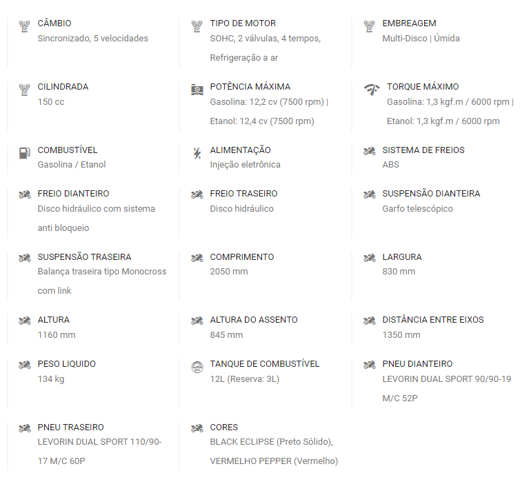 A Crosser S é a escolha perfeita para quem procura uma moto flex de 150cc que entrega resistência para o dia a dia, seja no asfalto ou na terra. O motor durável e econômico, conta com a tecnologia Blueflex, para você escolher entre gasolina, etanol ou ambos, o que for mais econômico.