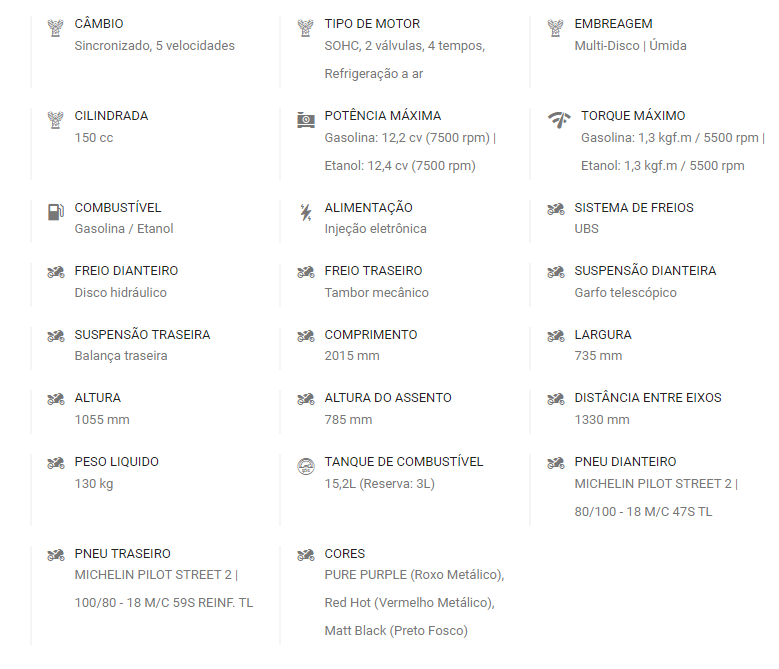 A Fazer 150 UBS é a escolha perfeita para quem procura uma motocicleta com personalidade esportiva, resistente tanto para o dia a dia quanto para novos desafios. O motor durável e econômico, conta com a tecnologia Blueflex e exclusivo acabamento preto fosco